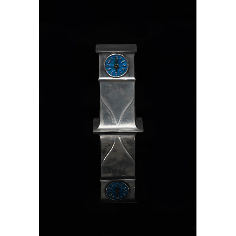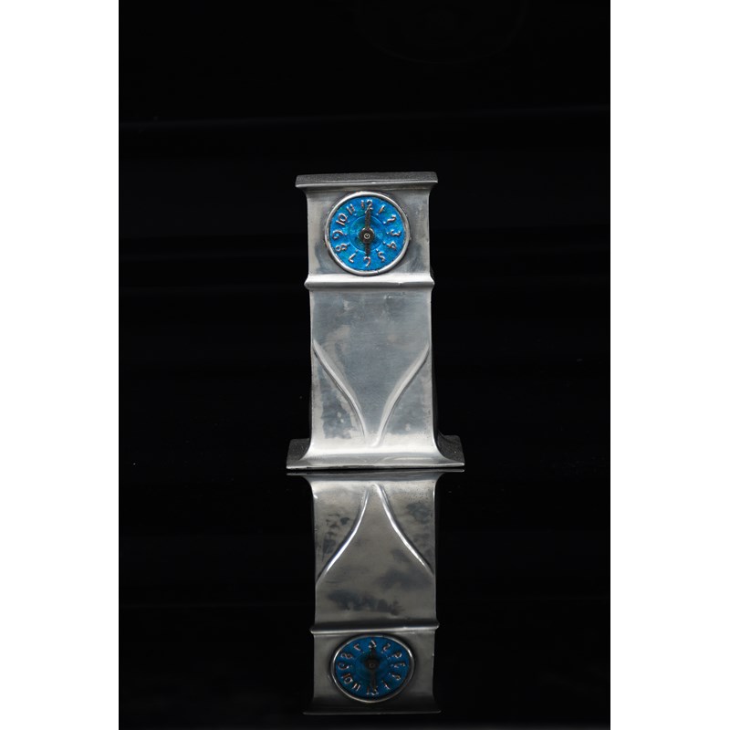 An unusual Liberty & Co Tudric Pewter clock the design attributed to Archibald Knox, model no. 0312, rectangular form with flaring base and mantel, the circular dial with Arabic numerals, enamelled blue, stamped Tudric 0312, later modern movement, 16.5cm. high