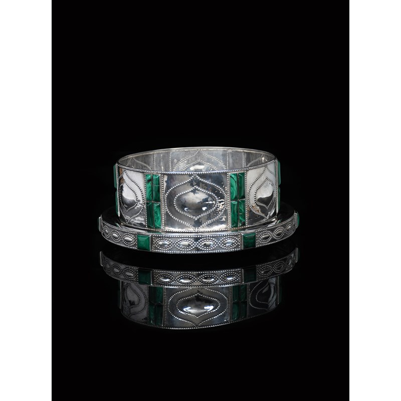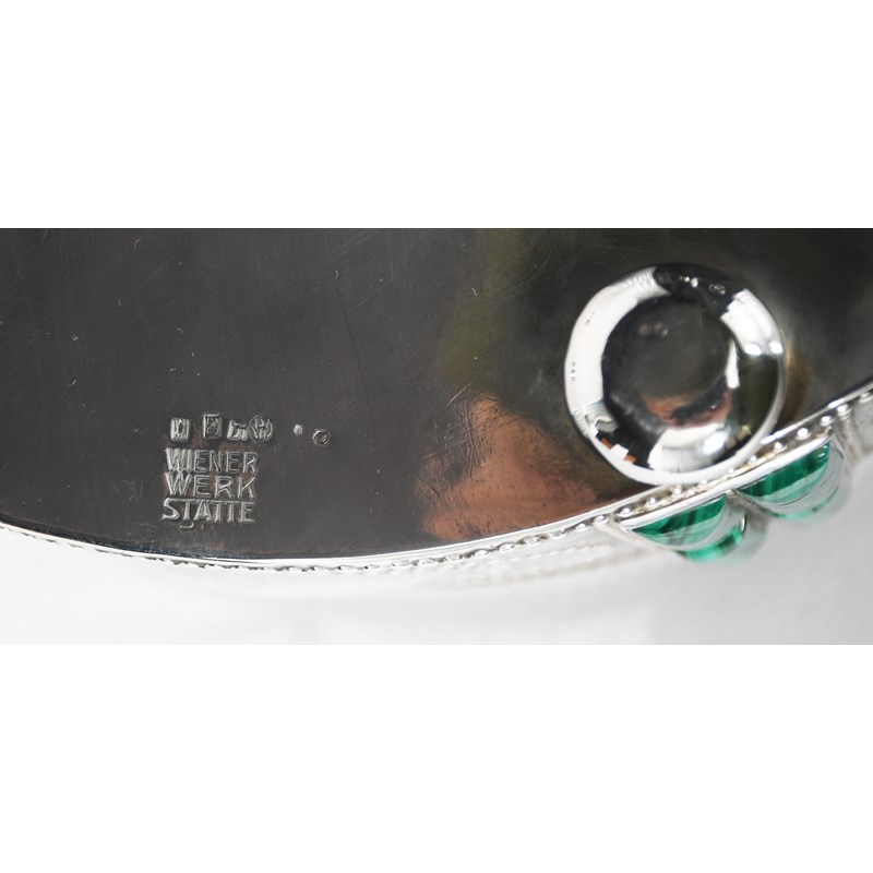 The silver and malachite tray relates to a flower dish designed by Hoffmann and made by the Wiener Werkstätte, for Palais Stoclet, 1908, recorded in the MAK archive WWF 94-84-3.