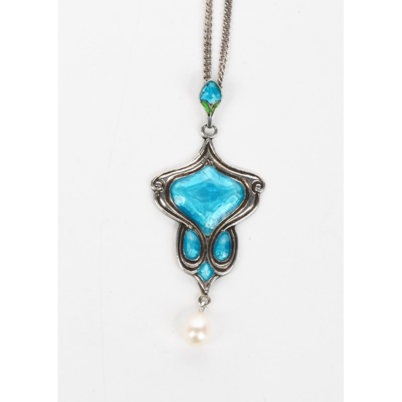 An Art Nouveau Queensway silver and enamel pendant necklace, scroll frame with panels of blue enamel, pearl drop, stamped marks, 5.3cm. drop