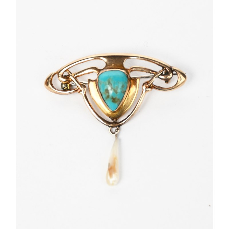 An Art Nouveau Henry Matthews gold brooch, pierced entrelac frame set with turquoise cabochon, with thin pearl drop, stamped marks, London 1901, 3.5cm. wide