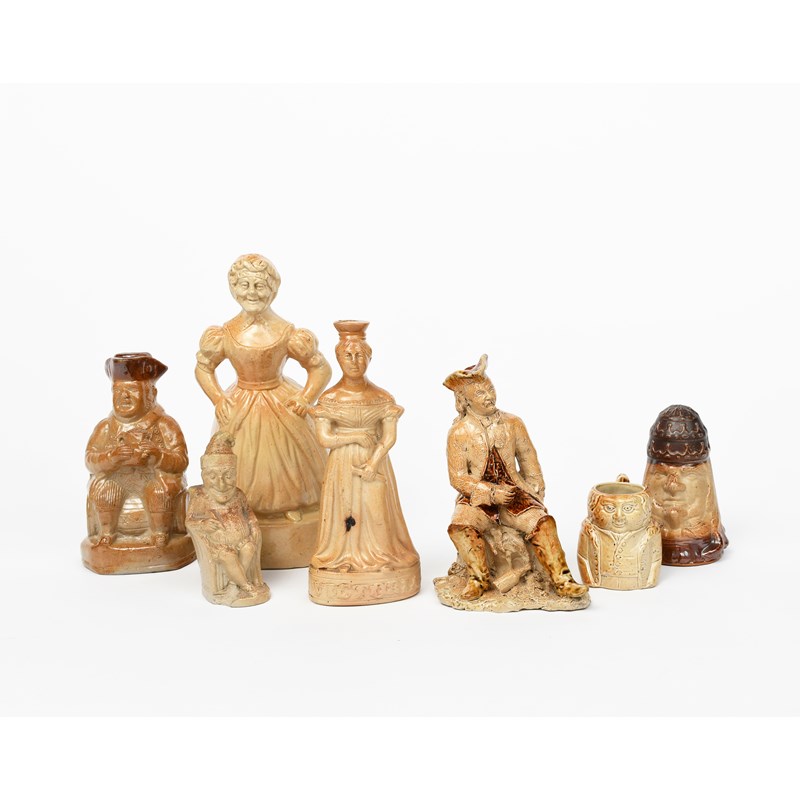 A Joseph Green Lambeth salt-glaze stoneware Victoria flask, 1837, a salt-glaze stoneware marriage cup, a stoneware figure of a man in tricorn hat seated and drinking, a Gardeners ink work salt glaze stoneware Mr Punch ink pot, and three other salt-glaze stoneware figural pieces, incised mark to base, 21cm. high (7)