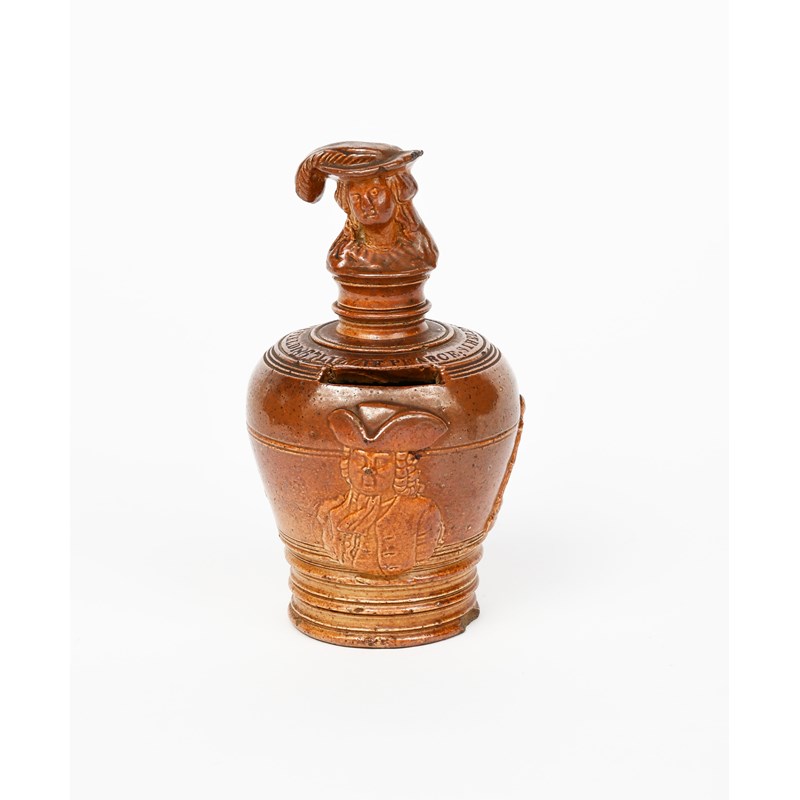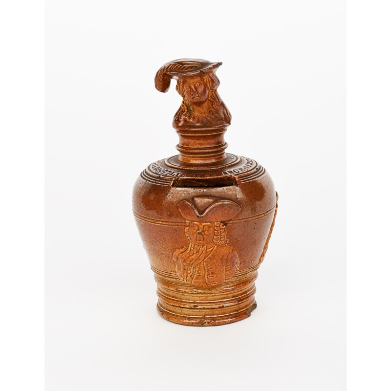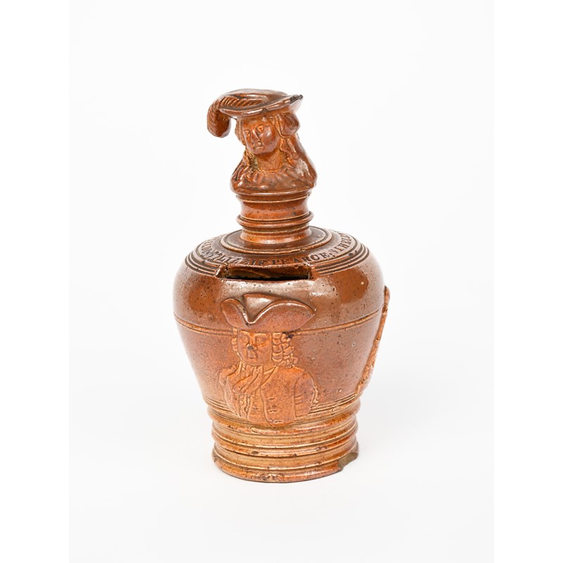A salt-glaze stoneware money box dated 1867, ovoid with portrait panel, the cover with a bust of a