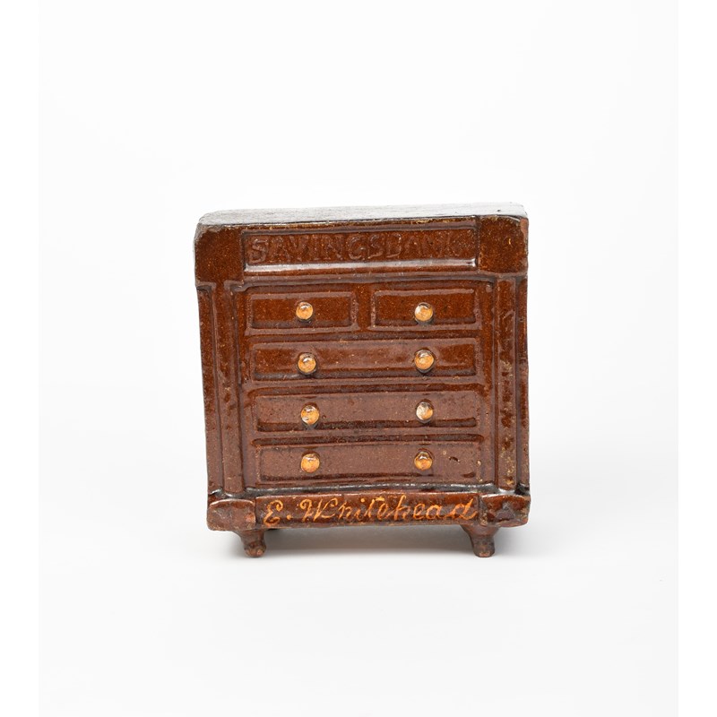 A slipware money bank modelled as a chest of drawers, moulded Savings Bank, the base inscribed in slip E Whitehead, with slip aperture to back, unsigned, chips, 19cm. high
