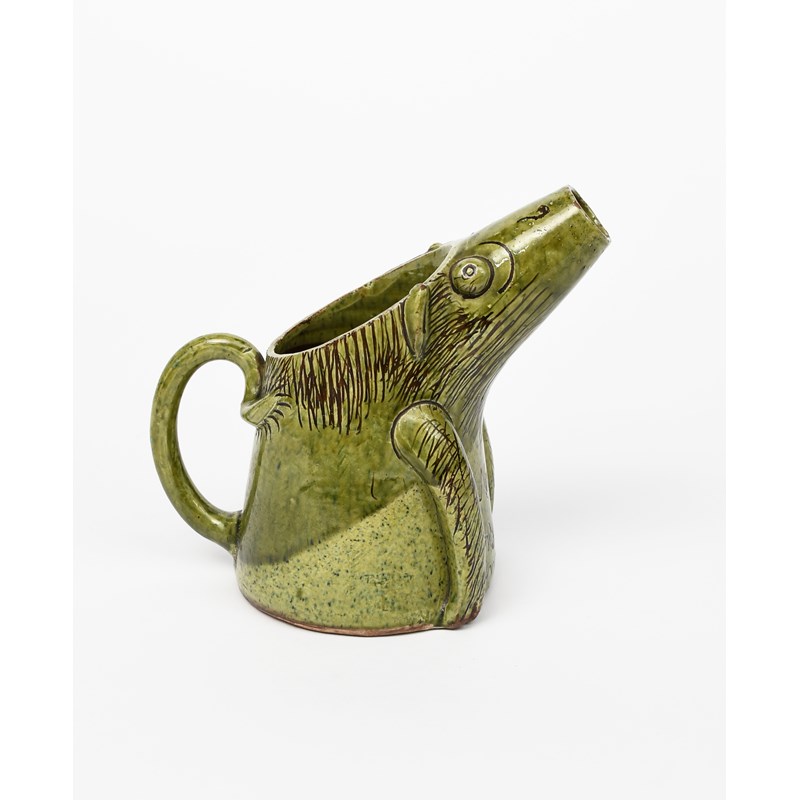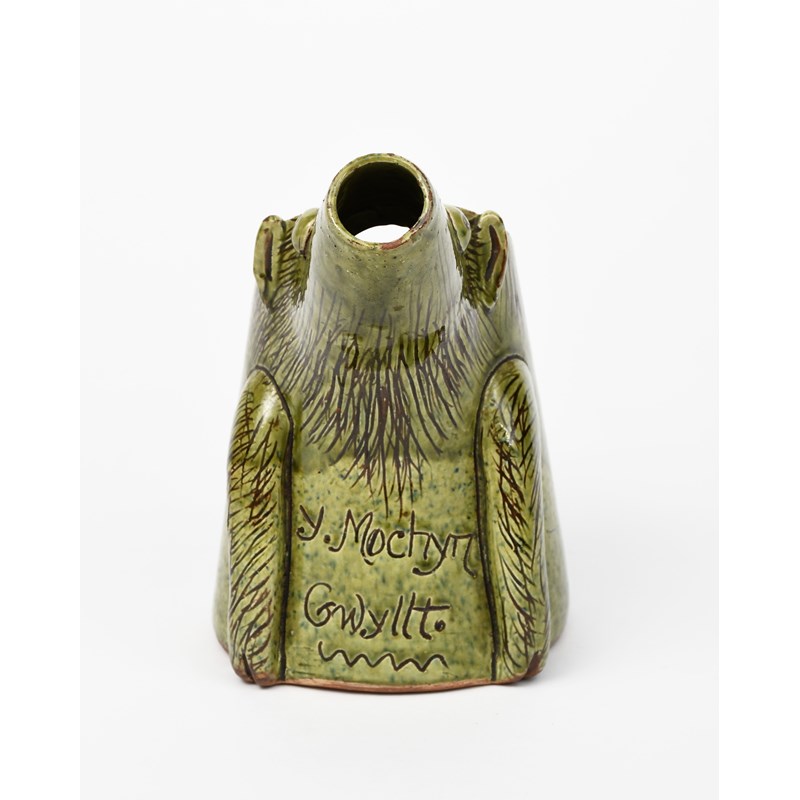 A Ewenny Pottery Wild Pig jug probably by Horace Elliott, tapering cylindrical body with conical snout spout, incised textured body inscribed Y Mochyn Gwyltt, (the wild pig), glazed green, incised Ewenny Pottery 1910 to base, 19.5cm. high