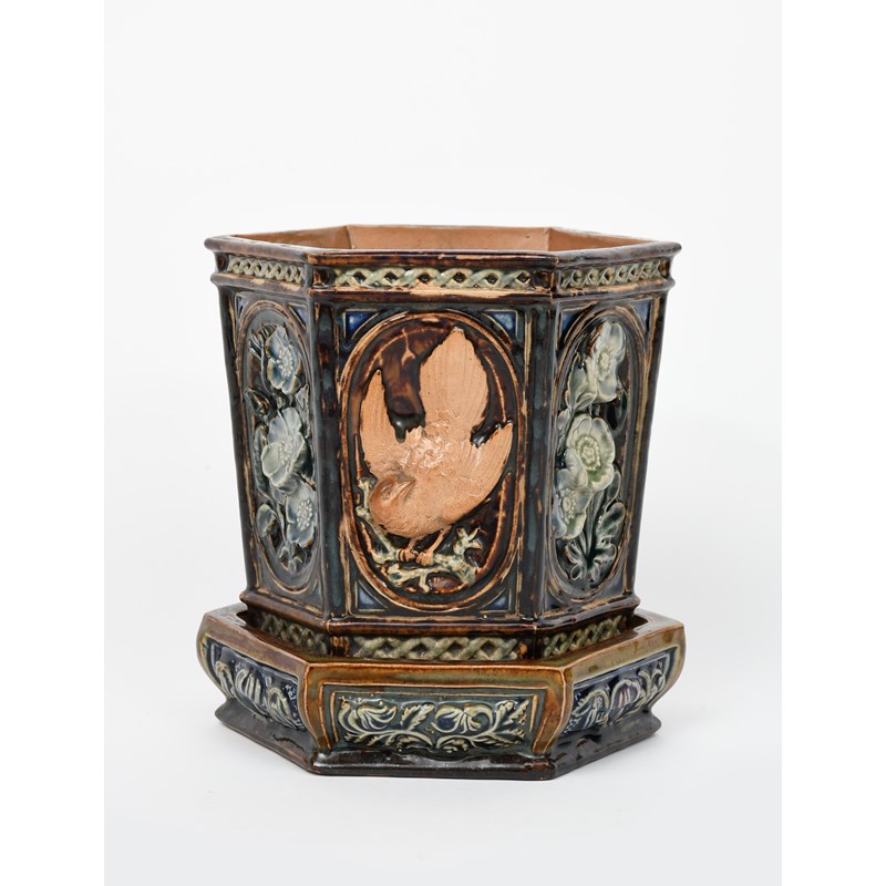 A Doulton stoneware jardiniere and stand, hexagonal tapering form, cast in low relief with panels of