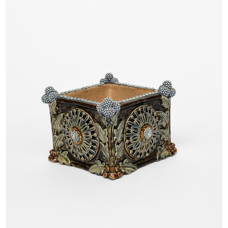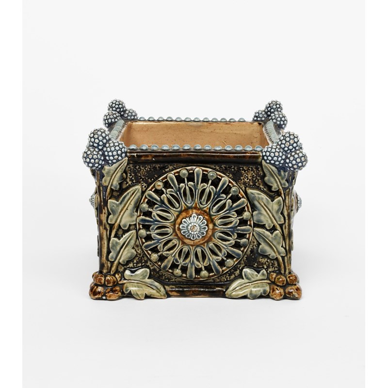 A Doulton Lambeth stoneware jardiniere, dated 1877, square section, modelled in relief with flower roundels, the corners modelled in relief with flower stems, in green, blue and brown, impressed marks to interior, minor losses, 16.5cm. high