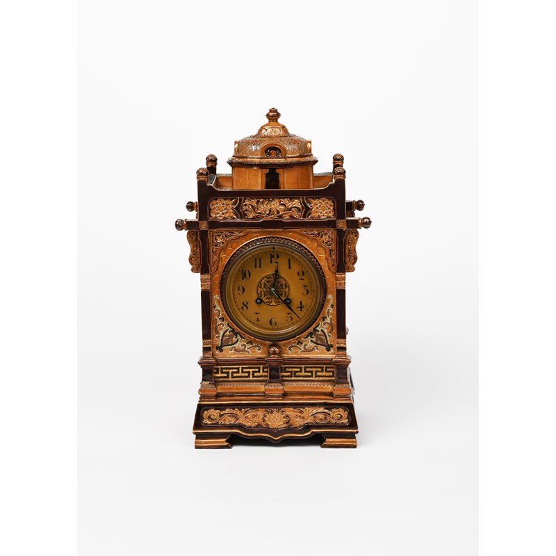 A large Doulton Lambeth stoneware mantel clock by Eliza Simmance, rectangular, architectural form with domed cupola, incised and applied with bead panels of flowers and foliage, in shades of brown, highlighted in white with gilt details, impressed factory marks, incised monogram, repaired finials, 42.5cm. high