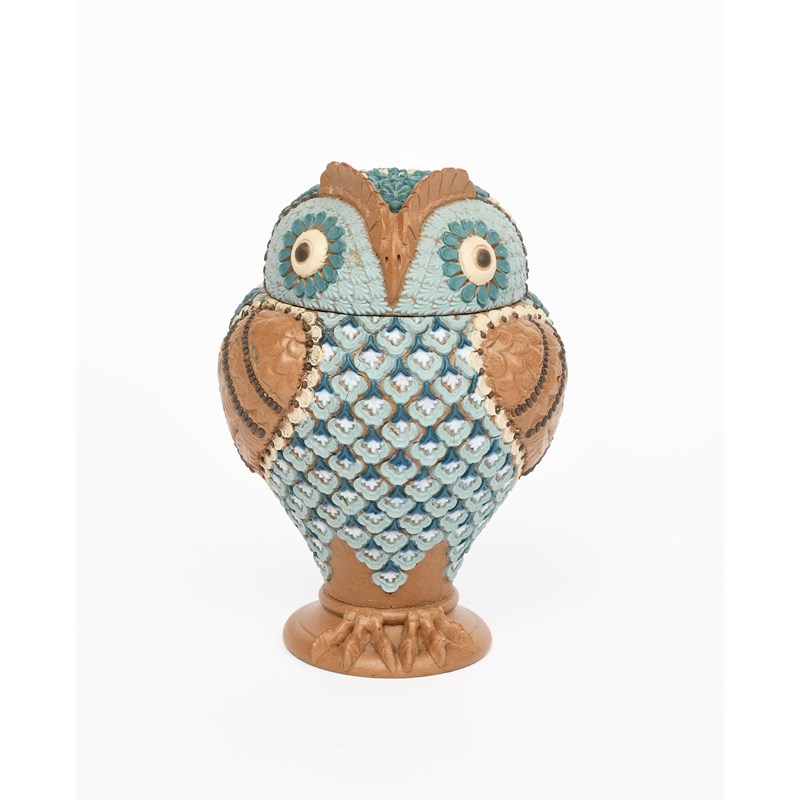 A Doulton Lambeth Silicon Ware owl jar and cover, the standing bird with applied blue and white feathers, impressed factory marks, 19cm. high (2)