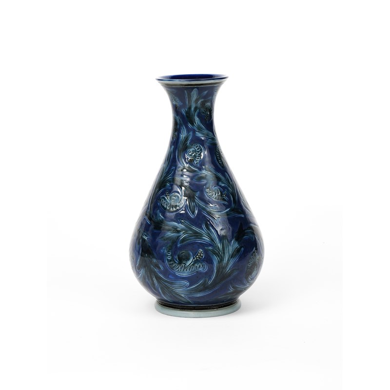 A Doulton Lambeth stoneware vase by Arthur Barlow, dated 1874, pear-shaped with flaring rim, incised with scrolling foliage in shades of blue on a blue ground, impressed marks, incised monogram, 29cm. high