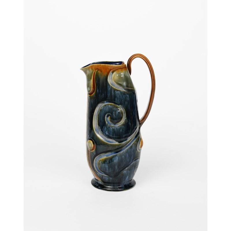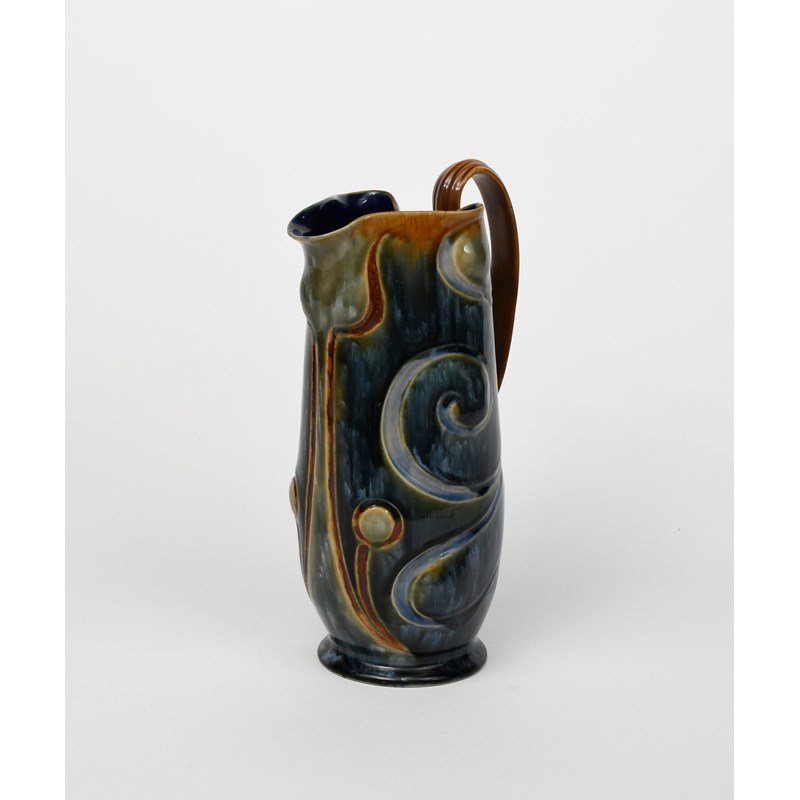 A large Doulton Lambeth stoneware ewer by Frank Butler, footed, cylindrical form with strap handle, modelled with scroll design, glazed streaked blue and green on a tan ground, impressed factory marks, incised FAB monogram, restored, 32cm. high