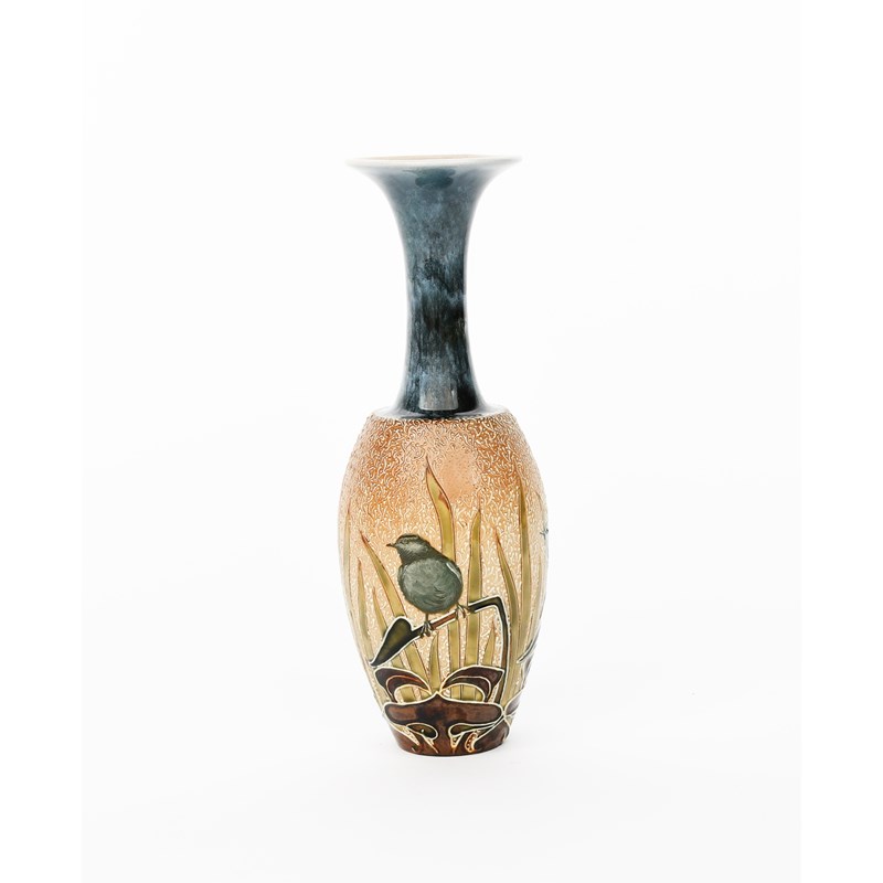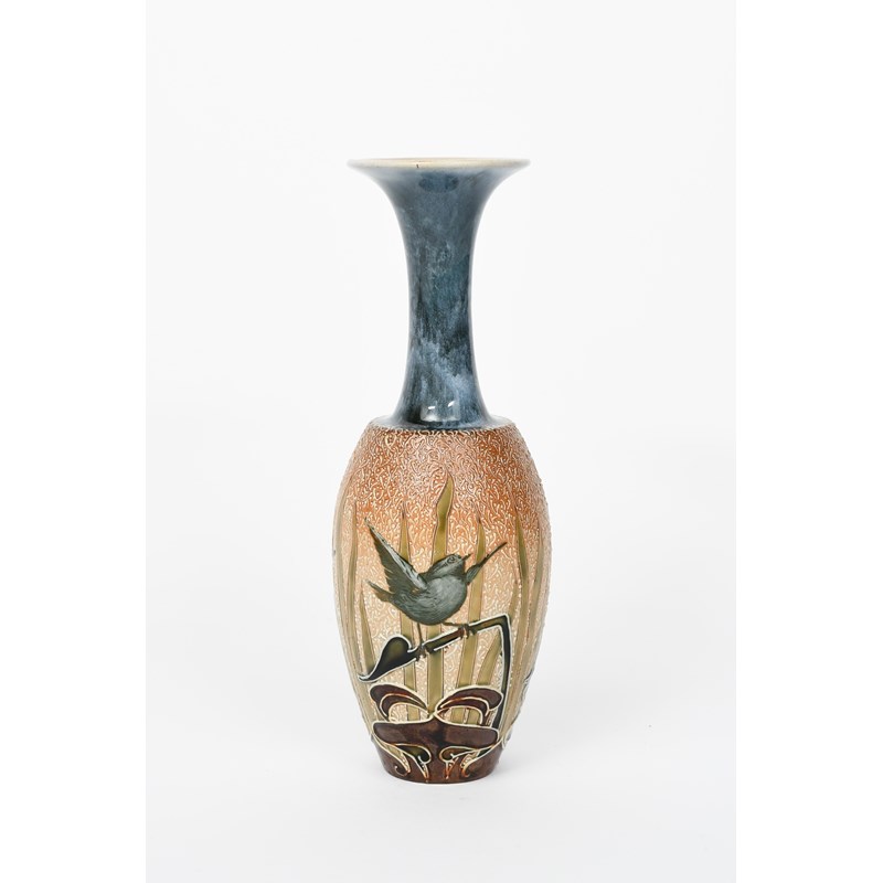 A Doulton Lambeth stoneware vase by Florence Barlow, shouldered form with cylindrical neck and flaring rim, pate sur pate decorated with birds perched on Art Nouveau foliage stems before a backdrop of reeds, in shades of green, white and brown on a textured slip ground, impressed factory marks, incised monogram, professionally restored neck, 23.5cm. high