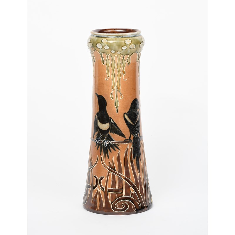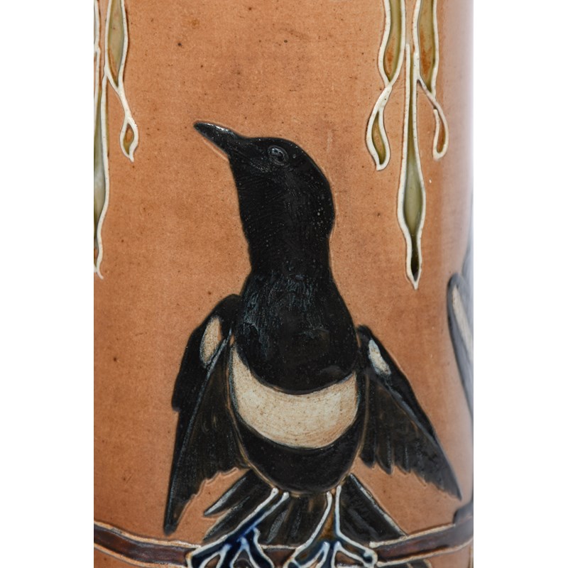 A rare Royal Doulton stoneware vase by Florence Barlow, waisted cylindrical form, pate sur pate decorated with magpies perched on a bough, between tubelined Art Nouveau foliate borders, in colours on a buff ground, impressed factory marks, incised monogram, 32.5cm. high