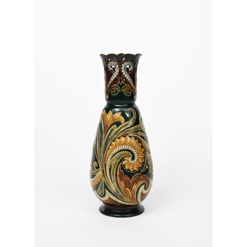 A Doulton Lambeth stoneware vase by Eliza Simmance, swollen form with pierced cylindrical neck, incised and applied with scrolling foliage with applied beadwork highlights, in shades of green, blue and brown, impressed marks and incised monograms, restored top rim, 32cm. high