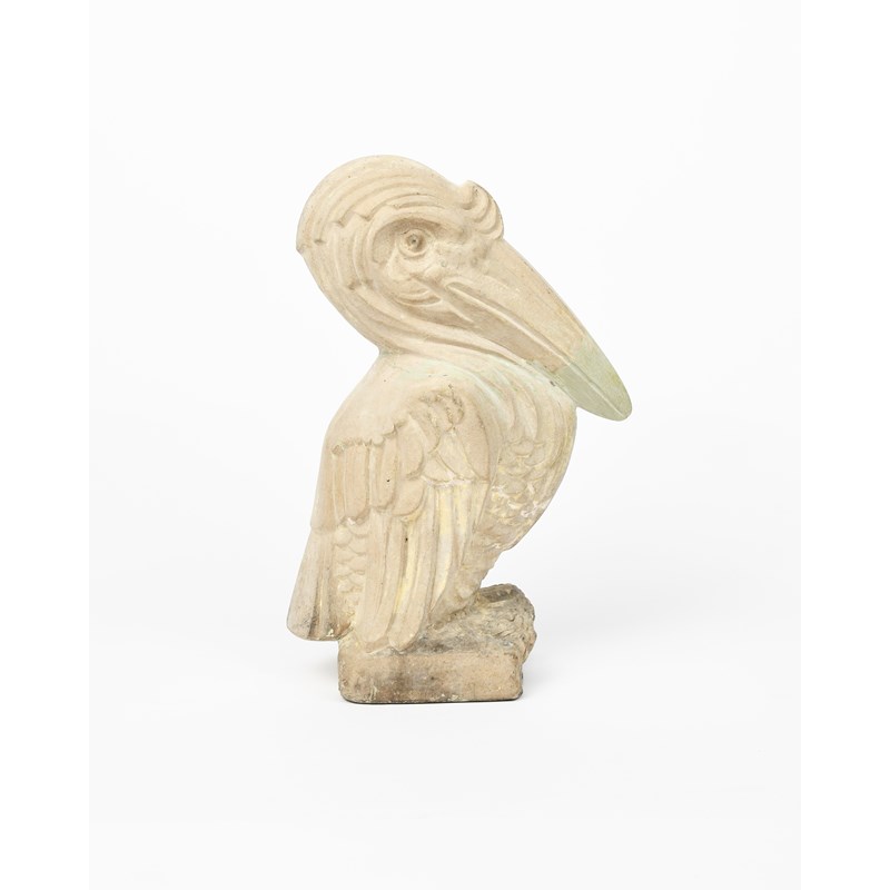 A Royal Doulton stoneware Pelican garden ornament, modelled perched on a square base, unglazed, impressed mark, restored, 38cm. high