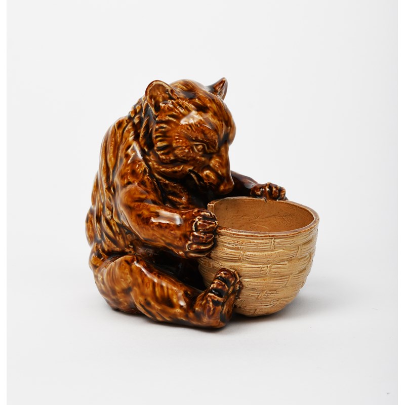 A Doulton Lambeth stoneware model of a seated bear, modelled looking into an upturned bee skep,