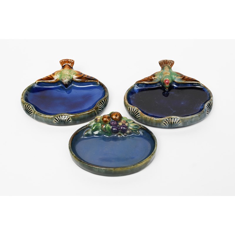 A Doulton Lambeth stoneware Bird bibelot designed by Harry Simeon, modelled flying over an oval dish, glazed in colours, another similar and a Doulton bibelot with fruit and foliage design, impressed marks, fruit bibelot restored, 15cm. wide. (3)