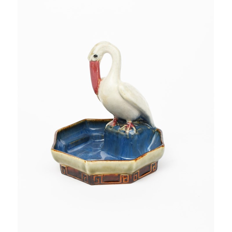 A Doulton Lambeth stoneware Pelican bibelot designed by Harry Simeon, modelled perched on an octagonal base, glazed in colours impressed marks, 13.5cm. high