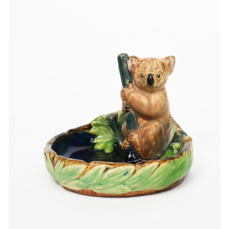 A Doulton Lambeth stoneware Koala Bear bibelot designed by Harry Simeon, on circular dish, glazed in