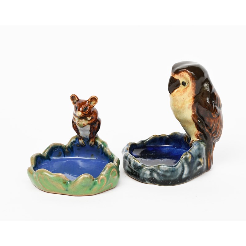 A small Doulton Lambeth stoneware Mouse bibelot designed by Harry Simeon, glazed in colours, and a Doulton Lambeth stoneware owl bibelot, impressed marks, owl restored, 7.5cm. high (mouse), (2)