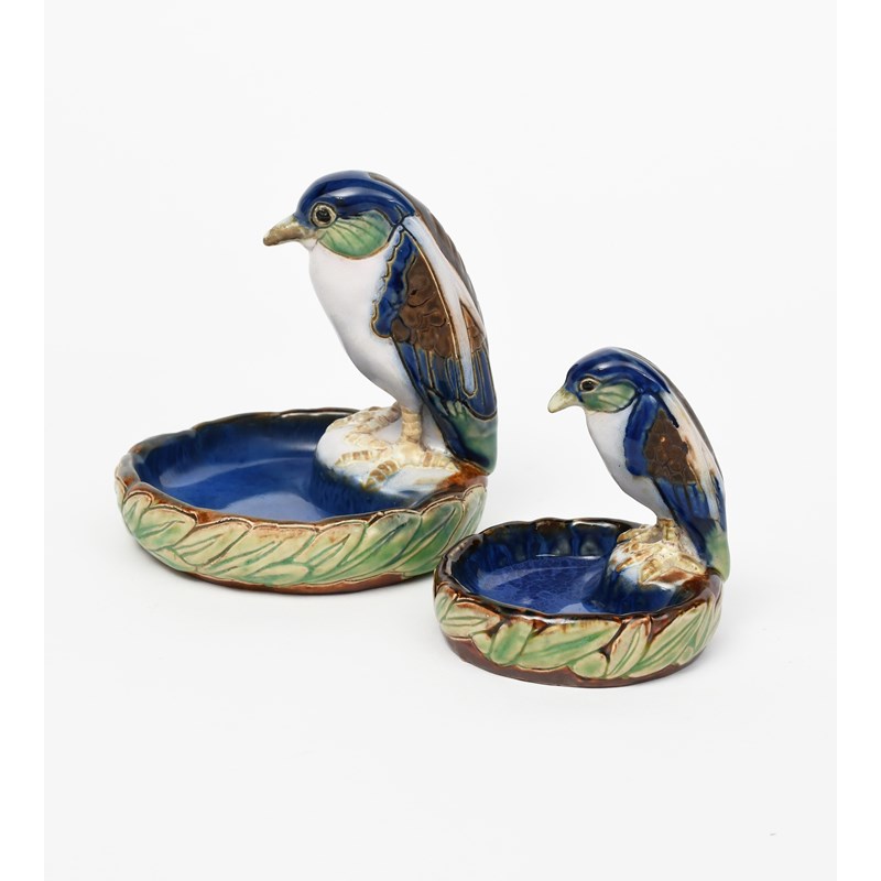 A large Doulton Lambeth stoneware Bird bibelot designed by Harry Simeon, glazed in colours, and another smaller, impressed marks, larger bibelot restored, 14cm. high (2)