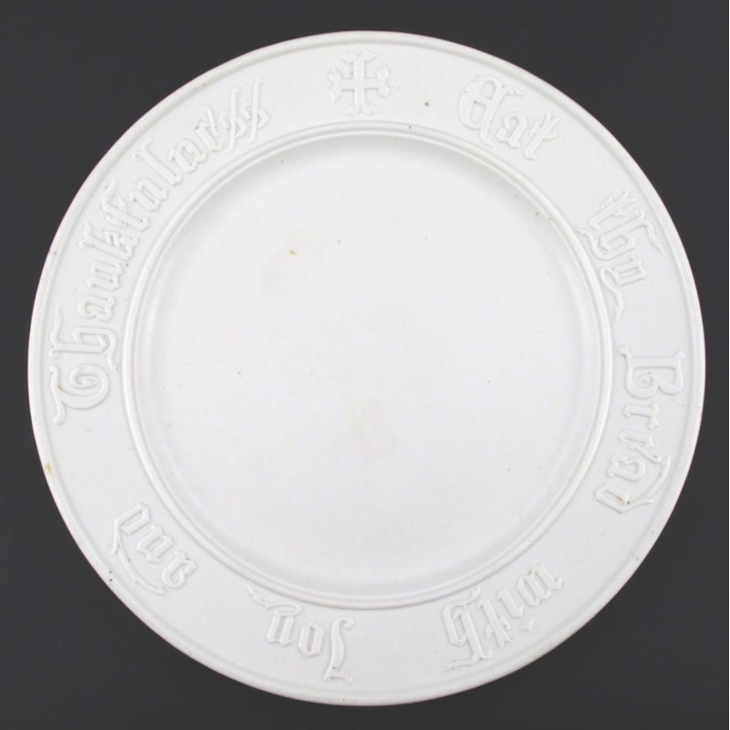 A Minton stoneware bread plate, the rim moulded in low relief with inscription 'Eat Thy Bread with Joy and Thankfulness'  unmarked 32.5cm. diam.