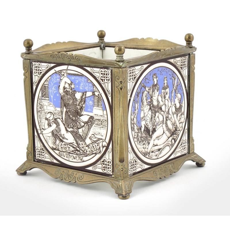 A Minton's Pottery tile planter, the tiles designed by John Moyr Smith,  in cats bronze frame impressed marks, to tiles, facsimile signature, one tile cracked 20cm. high