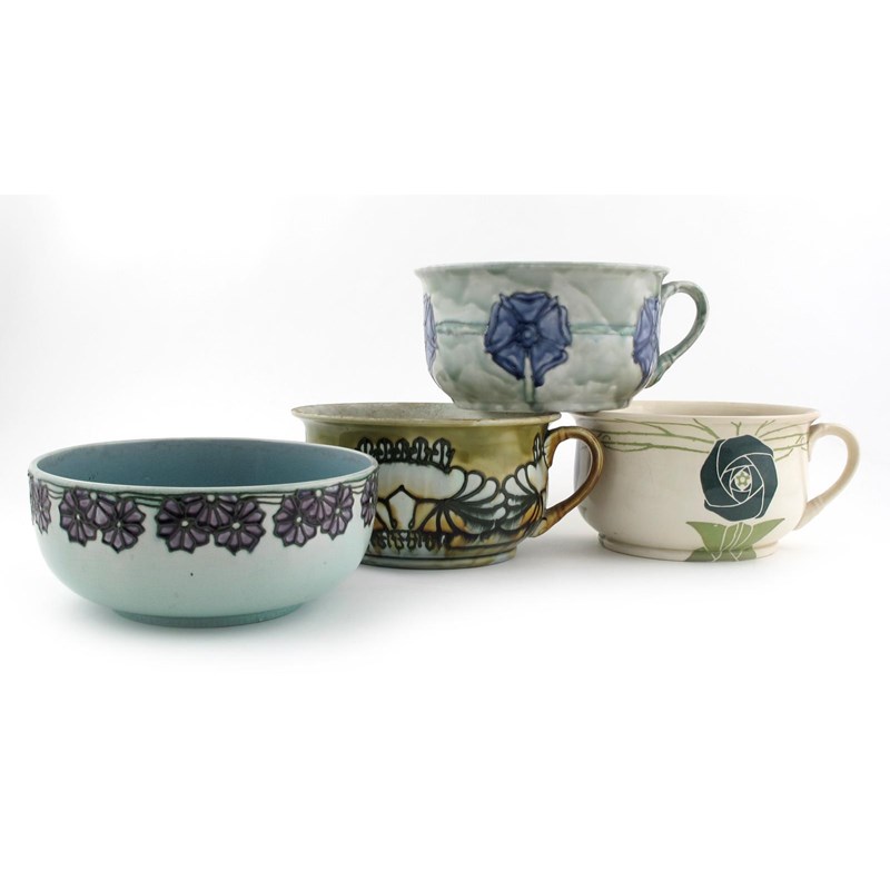 A Minton's Secessionist bowl, designed by John Wadsworth and Leon Solon, slip decorated with purple flowers on a pale blue ground, and three Minton's Secessionist chamber pots printed marks hairline to bowl, 23cm. diam.