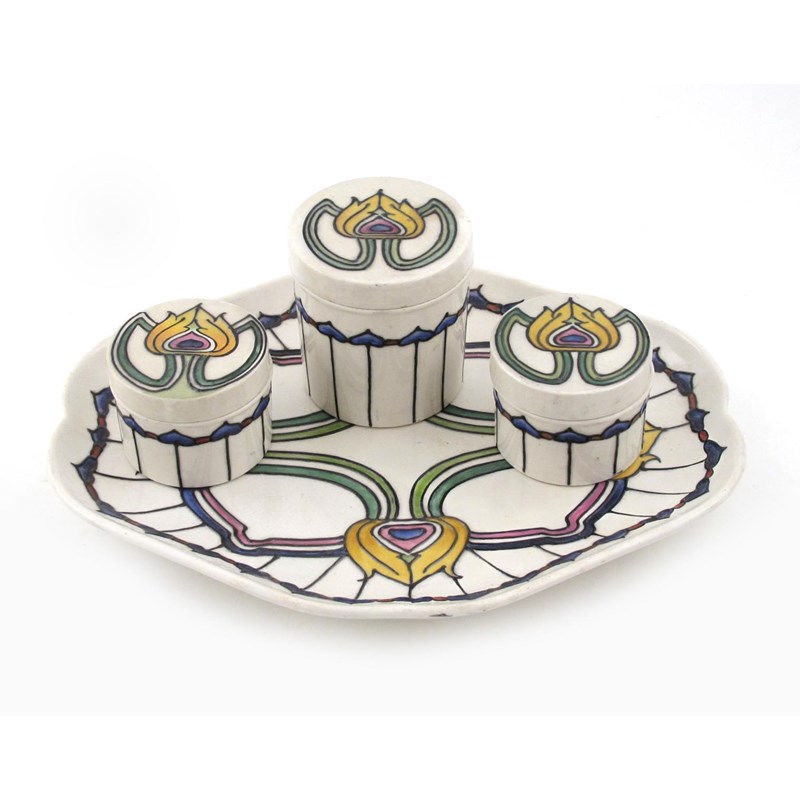 A Minton's Secessionist dressing table set, designed by John Wadsworth and Leon Solon, tubelined decorated with a yellow tulip flower design, on a white ground, comprising shaped tray and three covered cylindrical pots printed marks, professional restoration and minor chips 31.5cm. wide