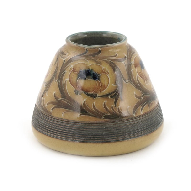 'Poppy' a James Macintyre vesta, designed by William Moorcroft, painted in shades of green, blue and red on a sand ground printed factory mark, small glaze frit to top rim 8cm. high
