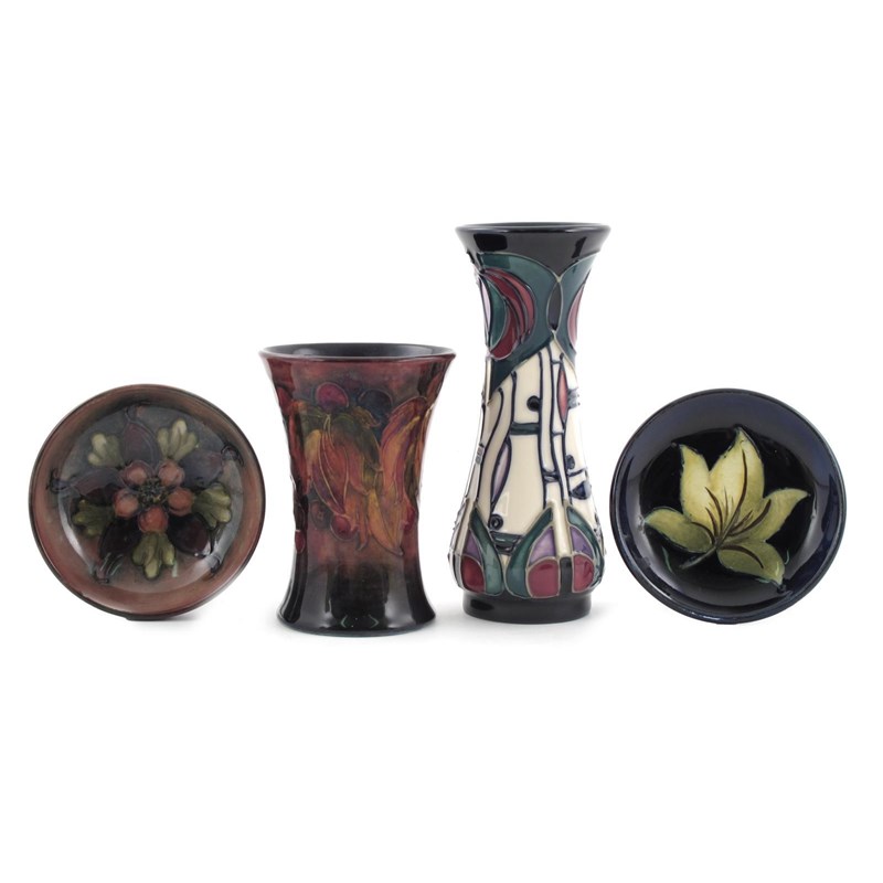 'Flambe Leaf and Berry' a Moorcroft Pottery vase, designed by William Moorcroft, waisted cylindrical form, glazed in flambe over yellow and green, a 'Flambe Columbine' dish and two other Moorcroft items impressed marks 9cm. high