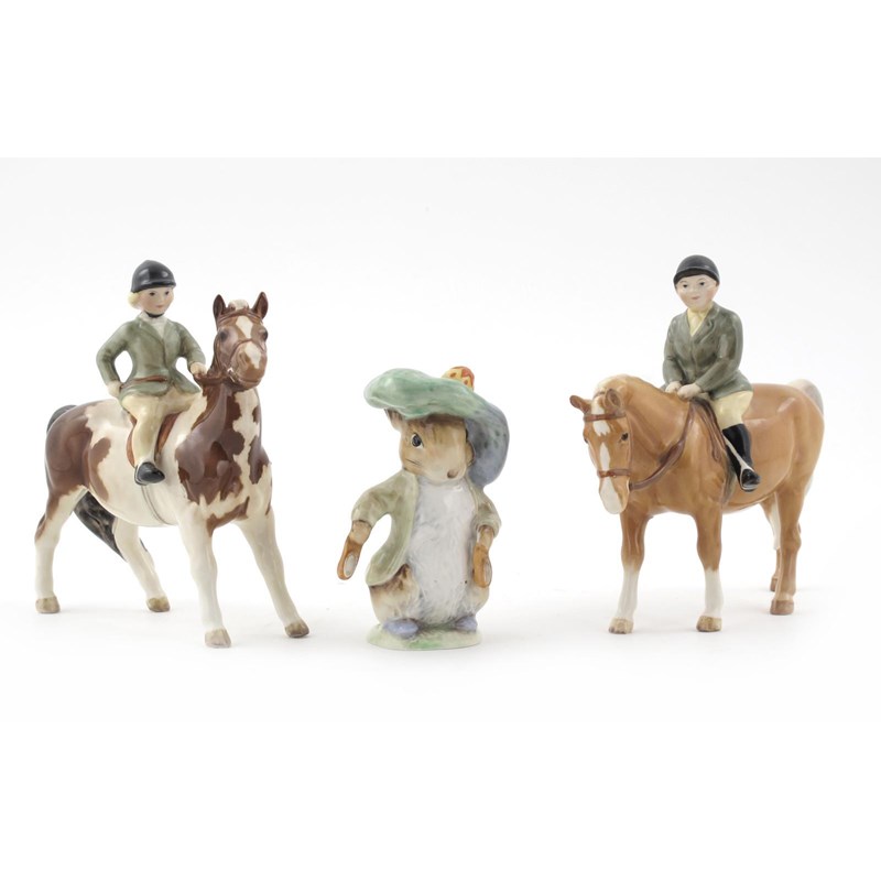 'Boy on Pony' and 'Girl on Pony' two Beswick figures, painted in colours, and 'Benjamin Bunny' a Beswick Beatrix Potter figure, Benjamin Bunny silver gilt backstamp, restoration