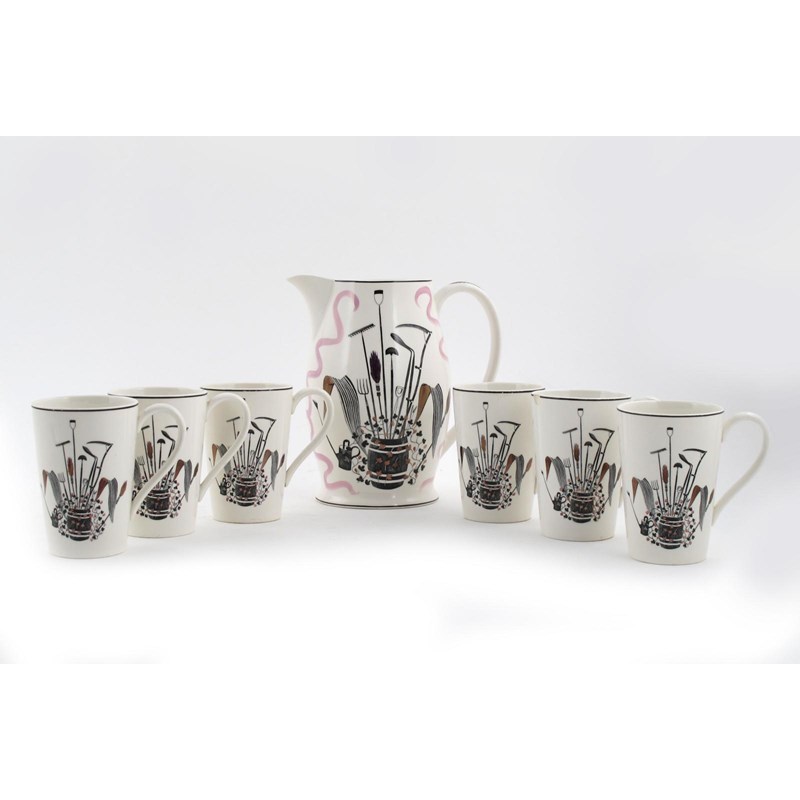 'Garden Implements' a Wedgwood Pottery lemonade set for six, designed by Eric Ravilious, printed in pink lustre and black with gardening tools stacked in a barrel, overgrown with ivy, comprising Liverpool shape jug and six cups printed marks, damages jug 20cm. high