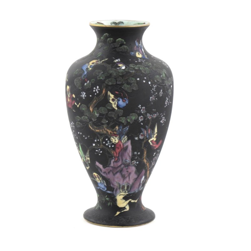 'Firbolg IV' an unusual Wedgwood Fairyland lustre vase, designed by Daisy Makeig-Jones, shape no.2034, printed in colours on a matt black ground with gilt top rim printed factory mark to base 22cm. high