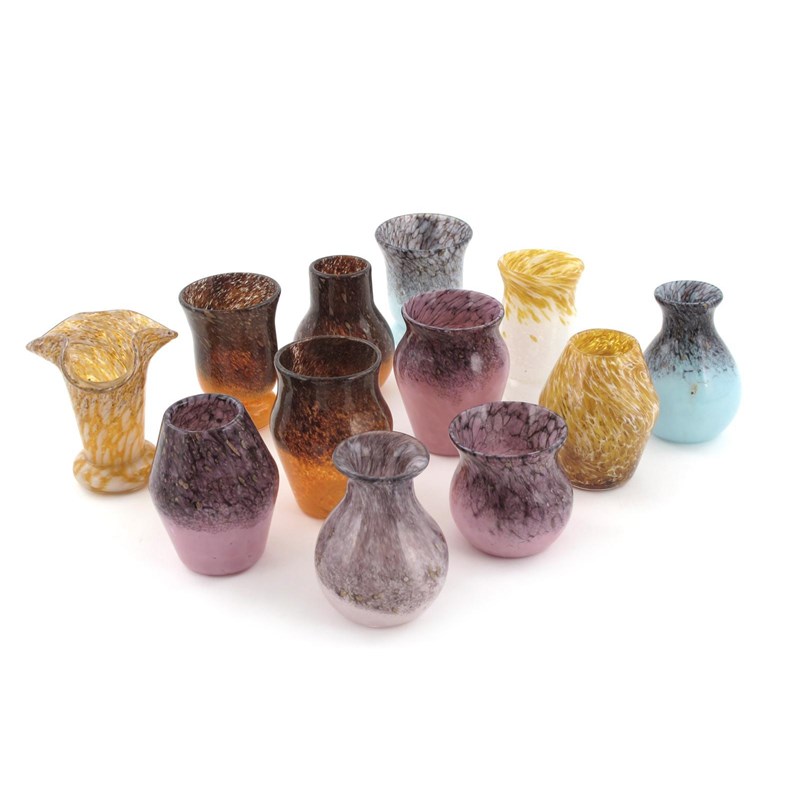 A collection of twelve Perthshire glass miniature vases, various shapes and colours with applied Monart paper labels tallest 10cm. high