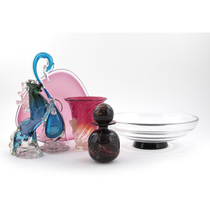 A Mdina glass perfume bottle and stopper, mottled brown glass cased in clear, a large Orrefors footed bowl, a Val St Lambert glass vase and four other glass items various marks, Mdina bottle 17cm. high