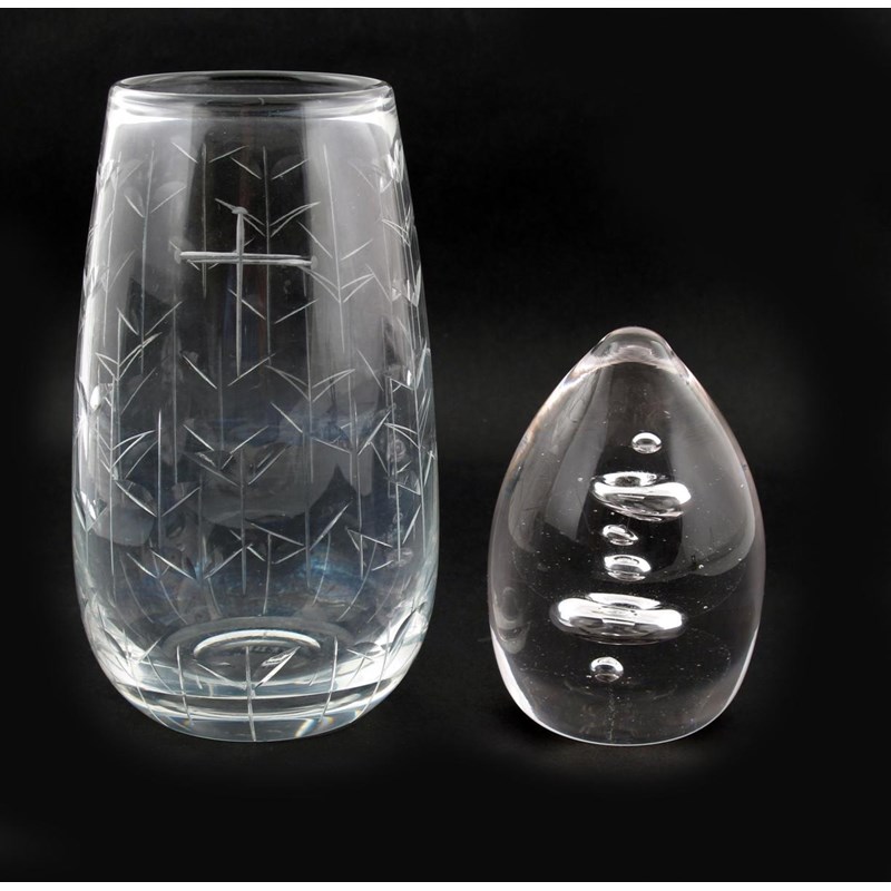 A Webb's cut glass vase, made for Coventry Cathedral, cut with vertical stem design, a clear glass paperweight designed by Ronald Stennett-Willson and three other glass items acid etched factory mark and etched inscription to base 17cm. high