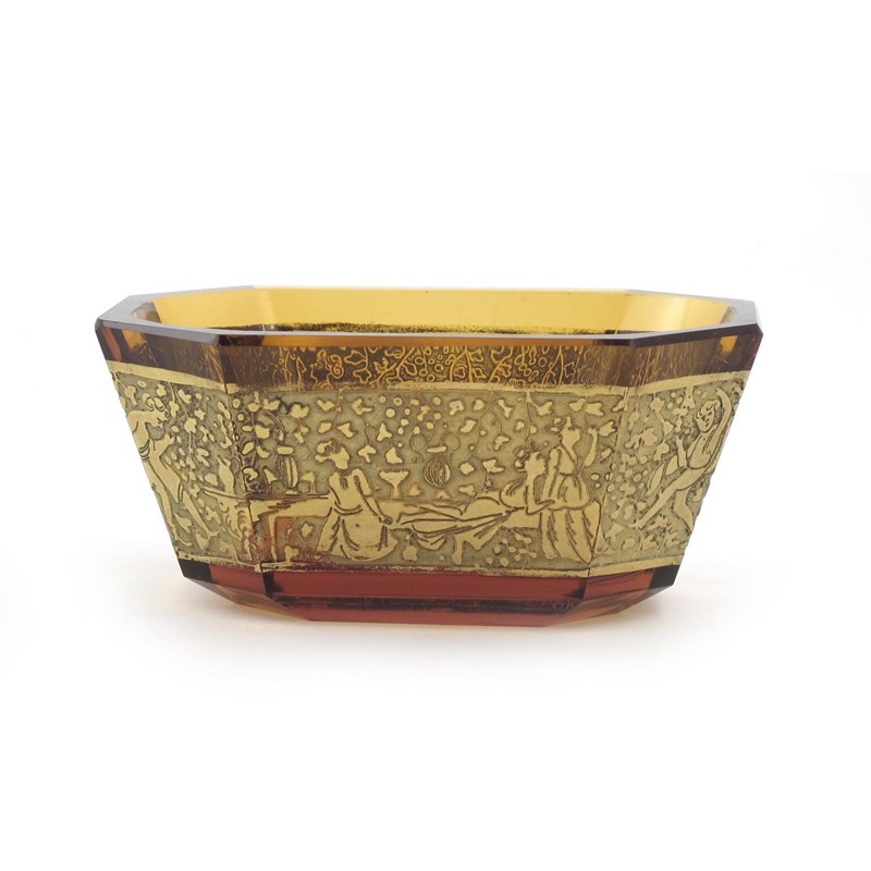 A Moser, Karlsbad octagonal amber glass trough, decorated with a gilt frieze of a Bacchanalian feast etched Moser Karlsbad 12cm wide