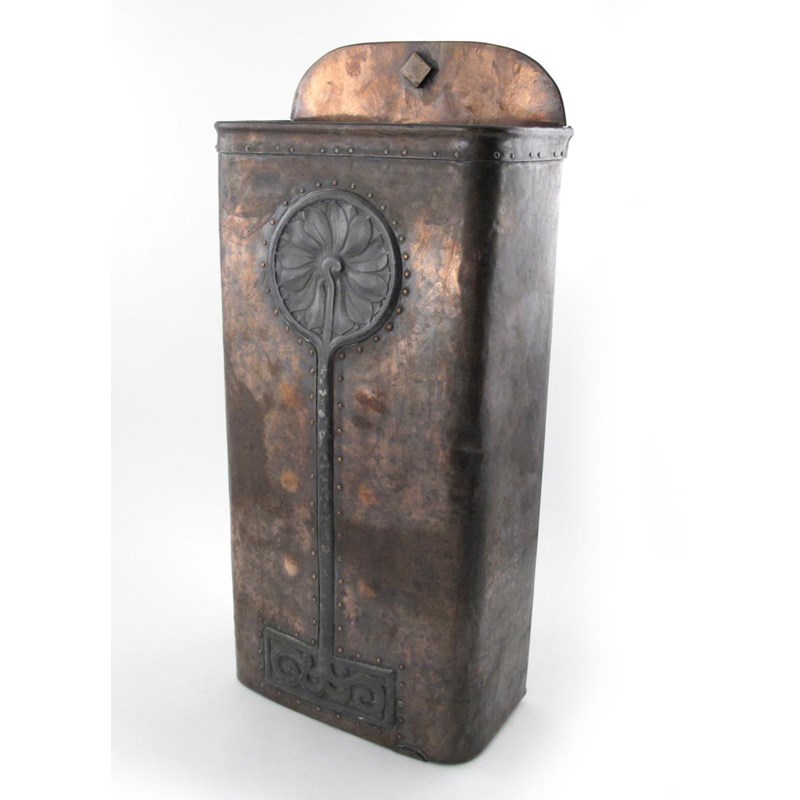 An Arts and Crafts patinated copper and pewter umbrella stand, in the manner of M H Baillie-Scott, set with pewter stylised flower unsigned 70cm. high