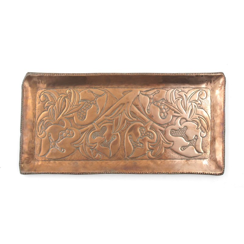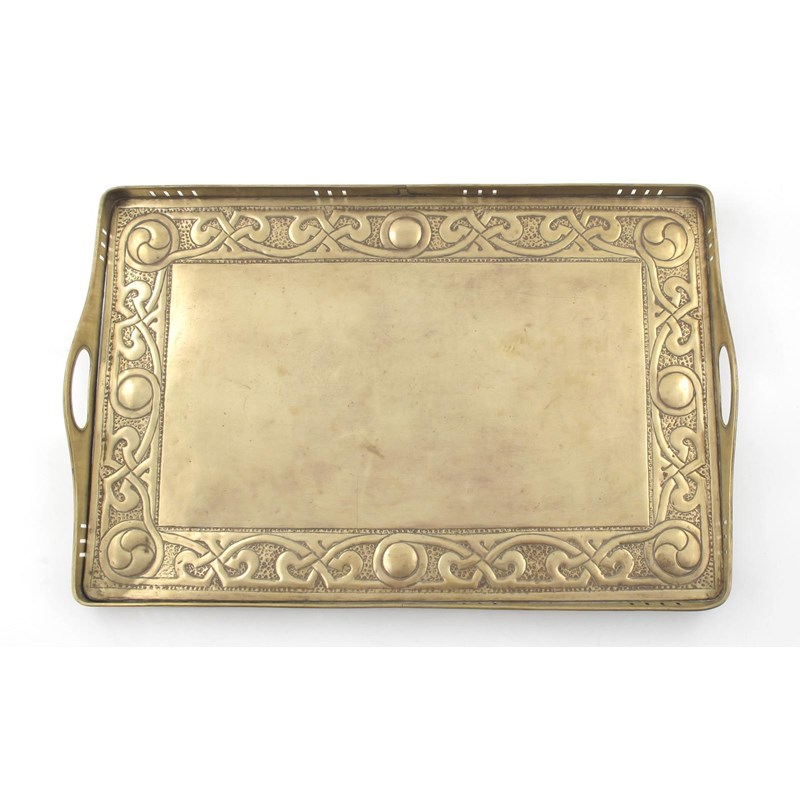 An Arts and Crafts copper tray, rectangular section with raised rim, the well stamped and worked in low relief with stylised flowers and foliage, and a large brass tray decorated with a border of entrelac unsigned copper tray 52 x 24cm.