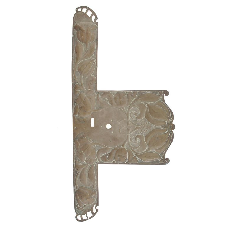 A large Arts and Crafts patinated brass door plate, pierced and stamped in low relief with bell flowers, a brass coal bin and three fire tools unsigned, door plate 67cm. long