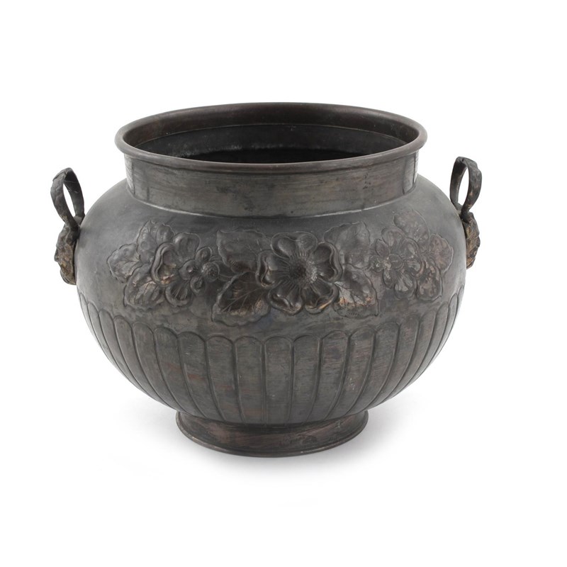 A W. Simpson patinated copper jardiniere, twin-handled form decorated with a frieze of Tudor rose stamped mark to base 22cm. high