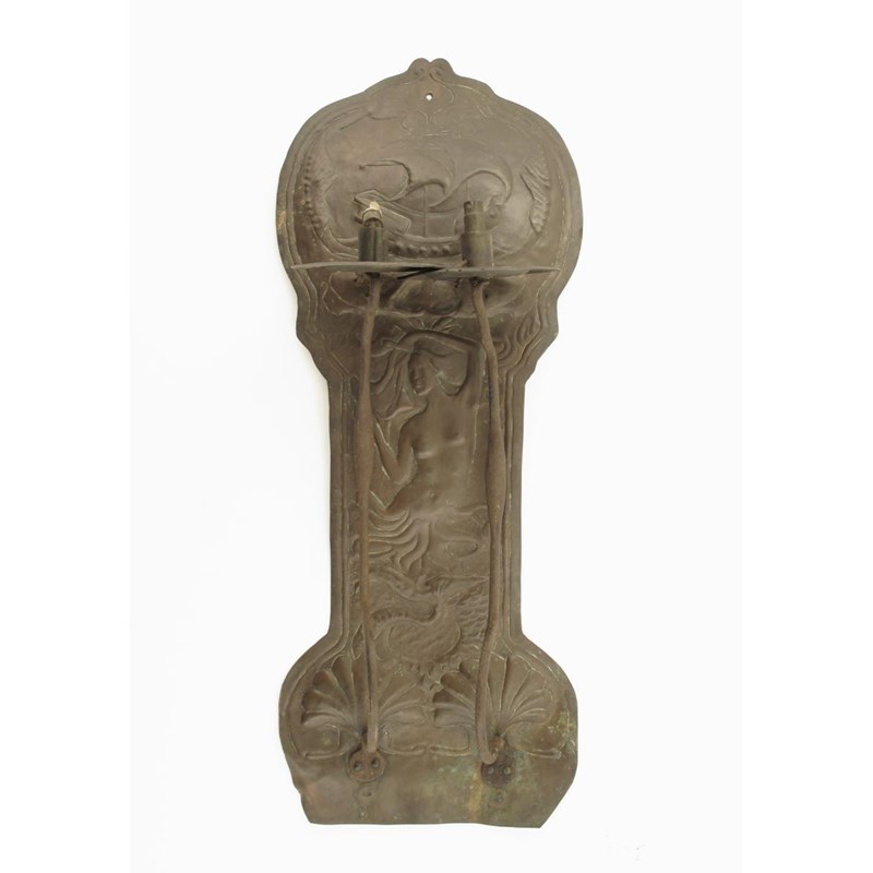 A tall Arts and Crafts patinated copper wall sconce, possibly Newlyn, hammered in low relief with a mermaid below a galleon at full sail, applied with two wrought iron sconces unsigned 80cm. high
