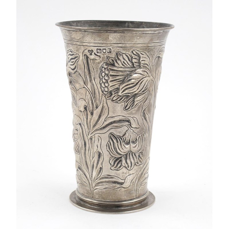 A silver footed vase, flaring cylindrical form, stamped in low relief with flowers and foliage, stamped marks, London 1900 18cm. high