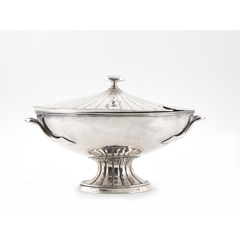 A Keswick School of Industrial Arts electroplated soup tureen and cover, by J Richardson, designed by Herbert Maryon, dated 1903, reeded pedestal form, signed J Richardson Keswick dated 1903 36cm. wide