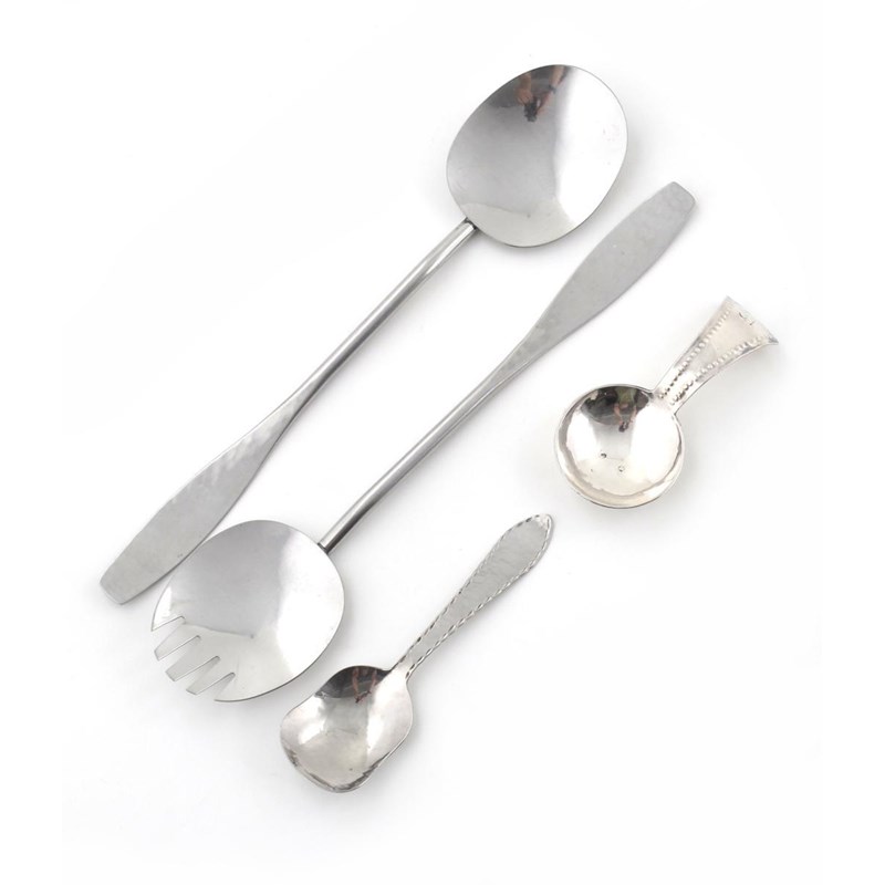A Keswick School of Industrial Arts caddy spoon, with stamped decoration and stamped SF monogram to terminal, another KSIA Staybrite caddy spoon and a pair of KSIA Staybrite salad servers stamped marks servers 25.5cm. long