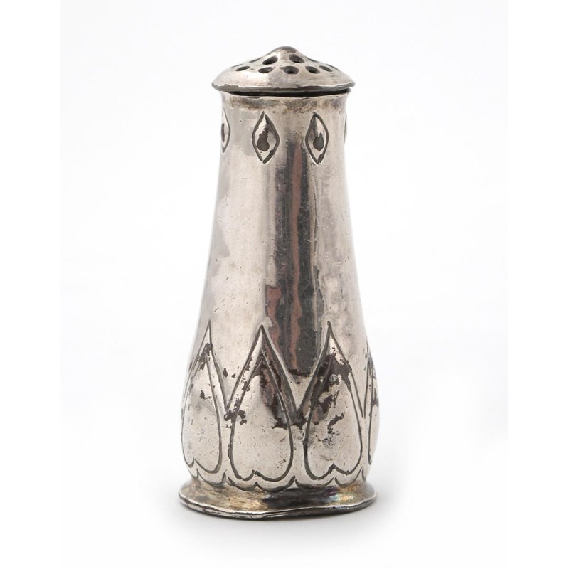 A Keswick School of Industrial Arts electroplated miniature pepper pot, with stamped stylised leaf decoration, stamped KSIA mark 6cm. high
