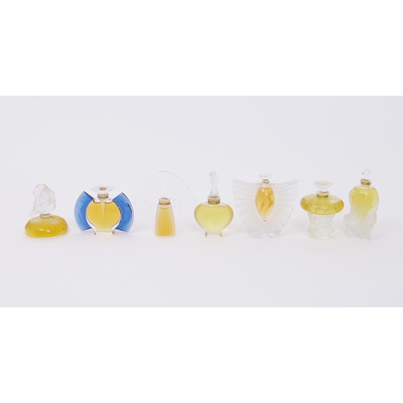 A modern Lalique clear and frosted glass tiara scent bottle and stopper, Jour et Nuit a limited edition modern Lalique scent bottle and stopper and five other modern Lalique scent bottles incised marks, 14cm. high (7)