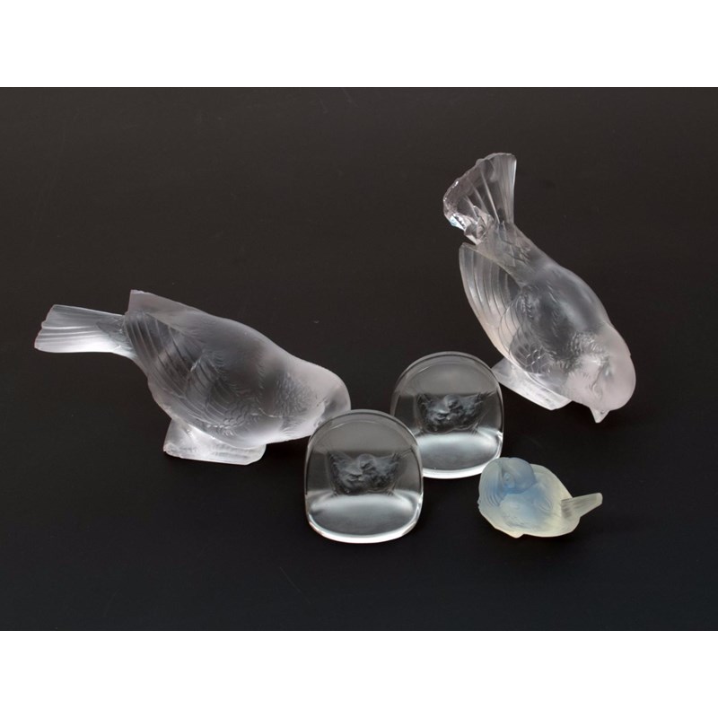 'Actinia' no.10-392 a Rene Lalique opalescent glass bowl, two Lalique bird table decorations, two Lalique bird menu holders and a Sabino opalescent glass chick Stencilled R Lalique France, factory marks, chips to table decoration and menu holders 26cm. diam. (6)