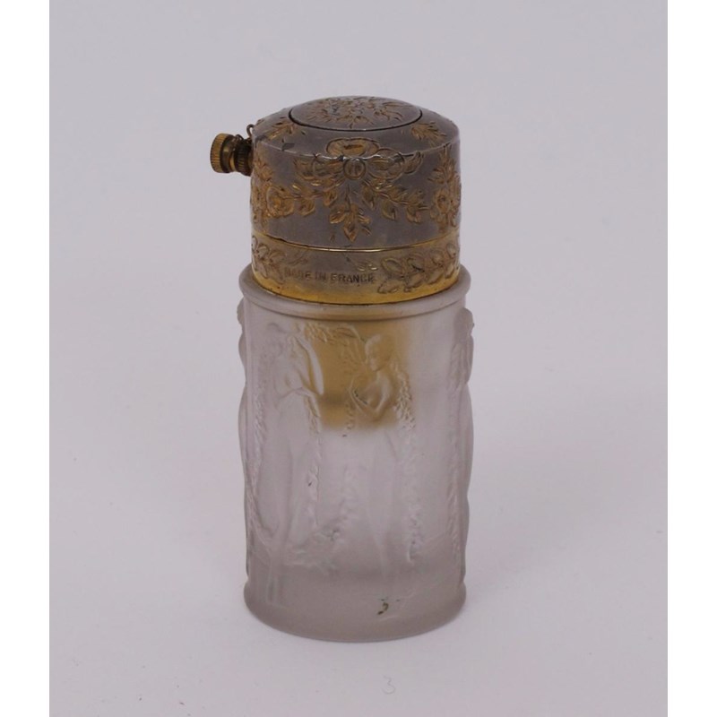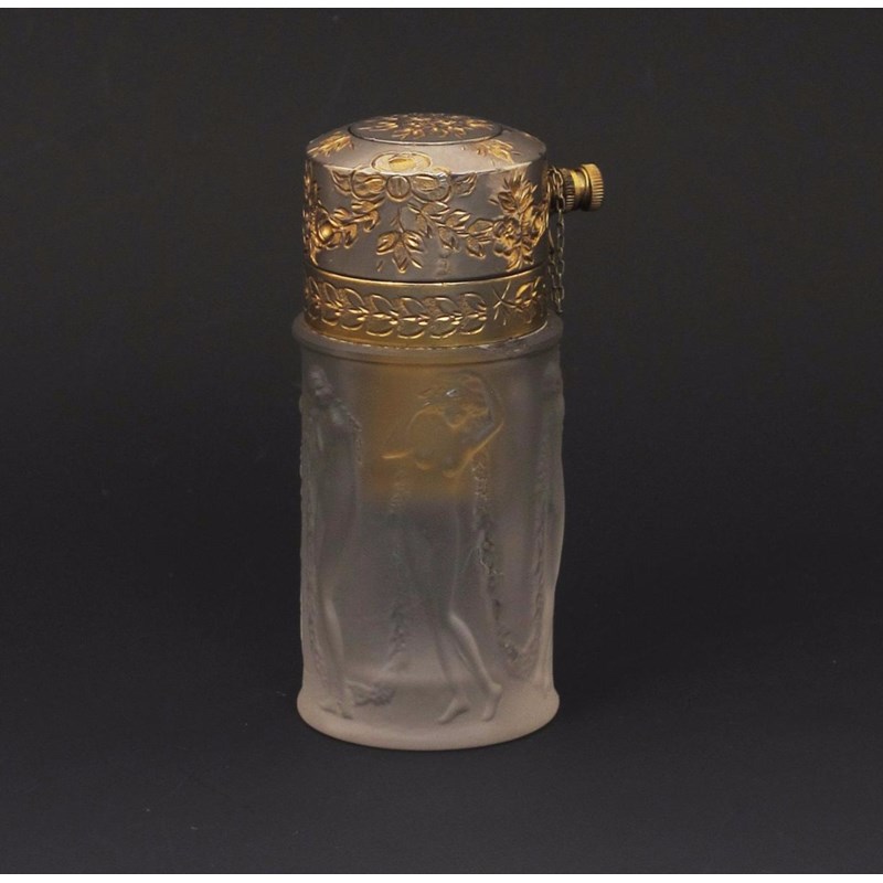 'Figurines et Guirlandes' a Lalique clear and frosted glass atomiser for Molinard designed by Rene Lalique, with gilt metal mount with push button diffuser mechanism, intaglio moulded R Lalique Made in France, small chip to shoulder, 9.5cm. high
