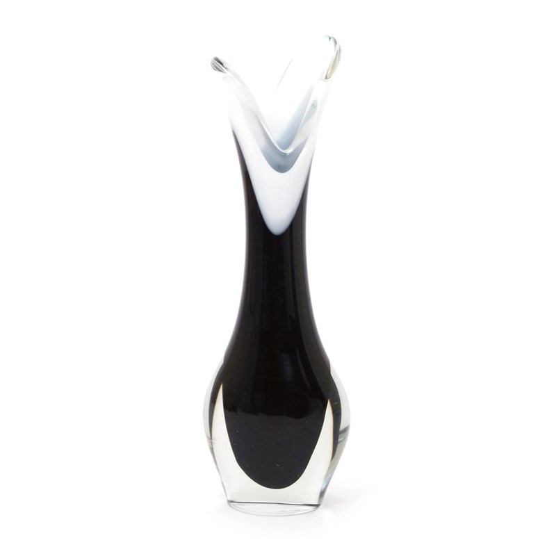 A Flygsfors Coquille cased glass vase, dated 1956, slender, tall form with pulled rim, dark black glass with white border, cased in clear etched marks 41cm. high